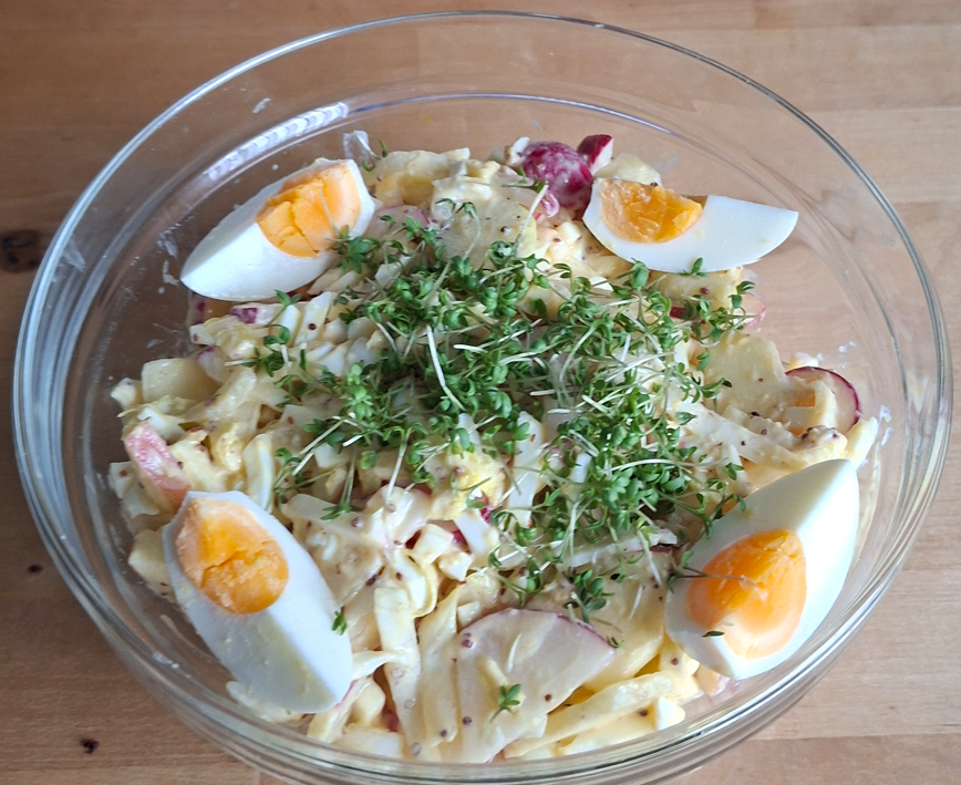 Jedes Jahr dasselbe und alles nur, weil ich Hühnereier mag: Vor Ostern ist das Angebot an gekochten, bunt gefärbten Bioeiern für mich unwiderstehlich. Nach Ostern sind zu viele davon übrig. Diese feine Eierresteverwertung ist im Kühlschrank einen Tag lang haltbar, schmeckt aber am besten am Tag der Zubereitung.