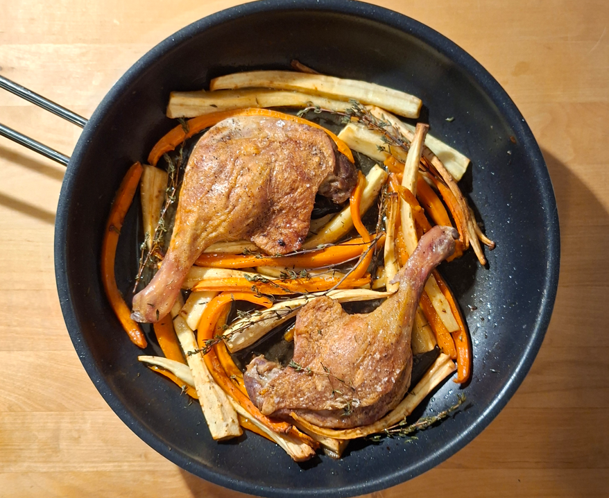 Jedes Wurzelgemüse eignet sich dafür. Wenn ich Pastinaken und Möhren verwende, schneide ich sie der Länge nach, andere Rüben eher in dickere Stücke. Es ist kein Gericht für Fettverächter, denn das Gemüse gart mit und im Entenfett.