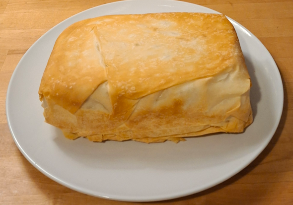 Eine Backform mit etwas Öl ausstreichen. Zwei Drittel der Filoblätter aus der Packung in die Form schichten und dabei jedes Blatt mit Öl bepinseln. Die Gemüsemasse hineingeben und die überhängenden Teigblätter über die Füllung klappen. Die restlichen Teigblätter darauf drapieren und jedes Blatt erneut mit Öl bepinseln.